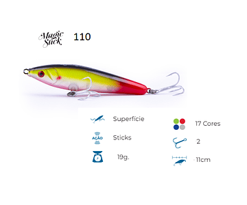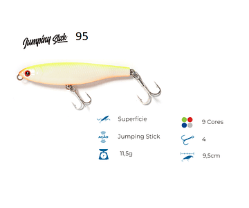 • Isca artificial de superfície com o equilíbrio diferenciado e flutuação rápida, excelente para utilização na técnica conhecida por catimbinha. No recolhimento contínuo com toques de ponta de vara torna-se de meia água com movimentos erráticos
